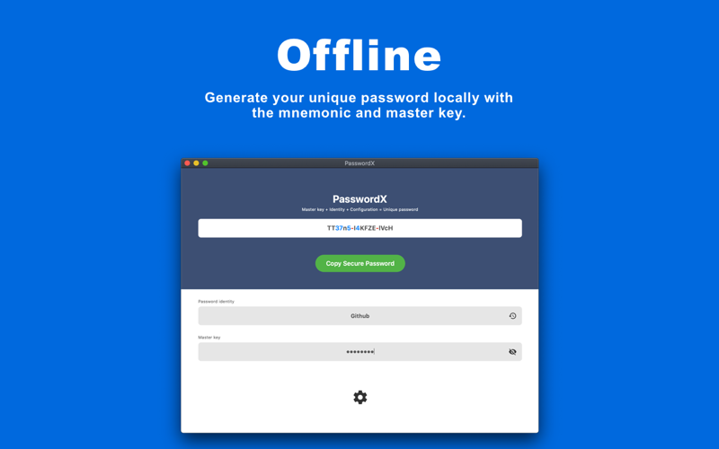 PasswordX is an offline password generator. You can generate strong passwords with password mnemonics and master passwords and your own password generation rules. No cloud services, no internet, as long as you have installed this app. You can get your password on either Mac or iOS. PasswordX also supports password auto-filling on iOS, you can use PasswordX more conveniently on web pages and other apps.