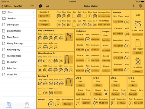 Patch Touch is a patch editor for the Dave Smith Mopho synthesizer. If you have a Mopho then this is the editor for you! Patch Touch gives you touch-based control over all of the voice and sequencer parameters on your Mopho synthesizer. Just make a change on the screen, and the change is instantly sent to your synthesizer.