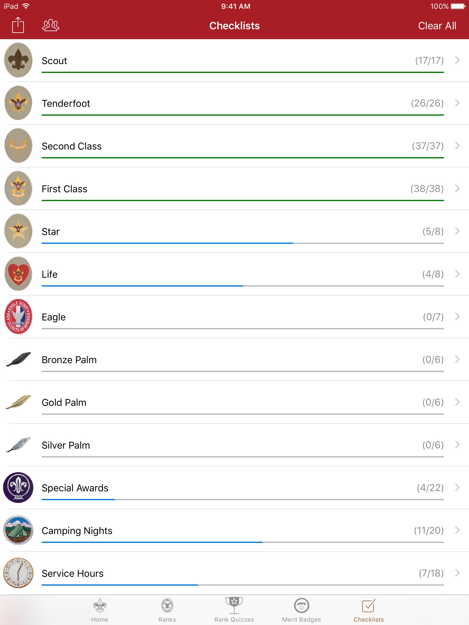 Checklists for each rank, special awards, camping nights, and Merit Badges are available for the scouts to log their progress.