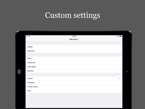 This app provides all features that a swipe keyboard has, such as accurate recognition, user words, auto insert a space, smart Shift key and so on.