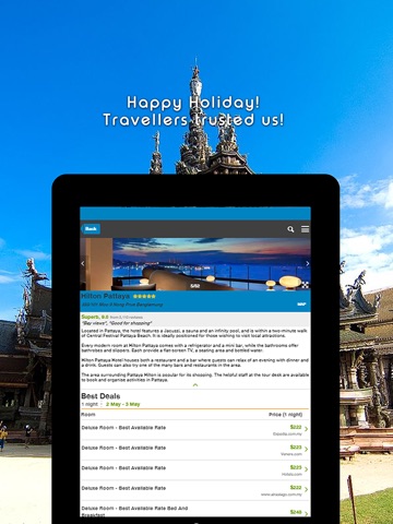 Pattaya Thailand Hotel Search, Compare Deals & Book With Discount help you to find and compare the best hotel deals from all major travel websites with one quick and easy search. No matter where in the world you are looking, how much is your budget, even at the very last minute, this app will find you the cheapest one to fit your budget and get you the best value for your money.