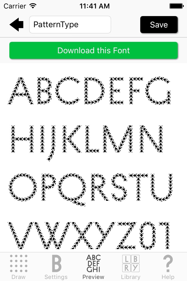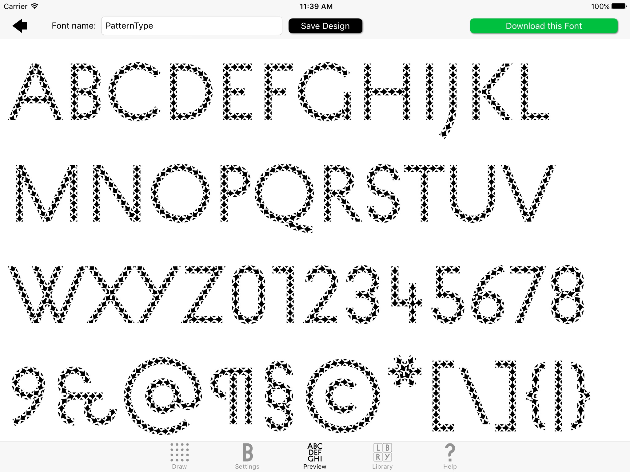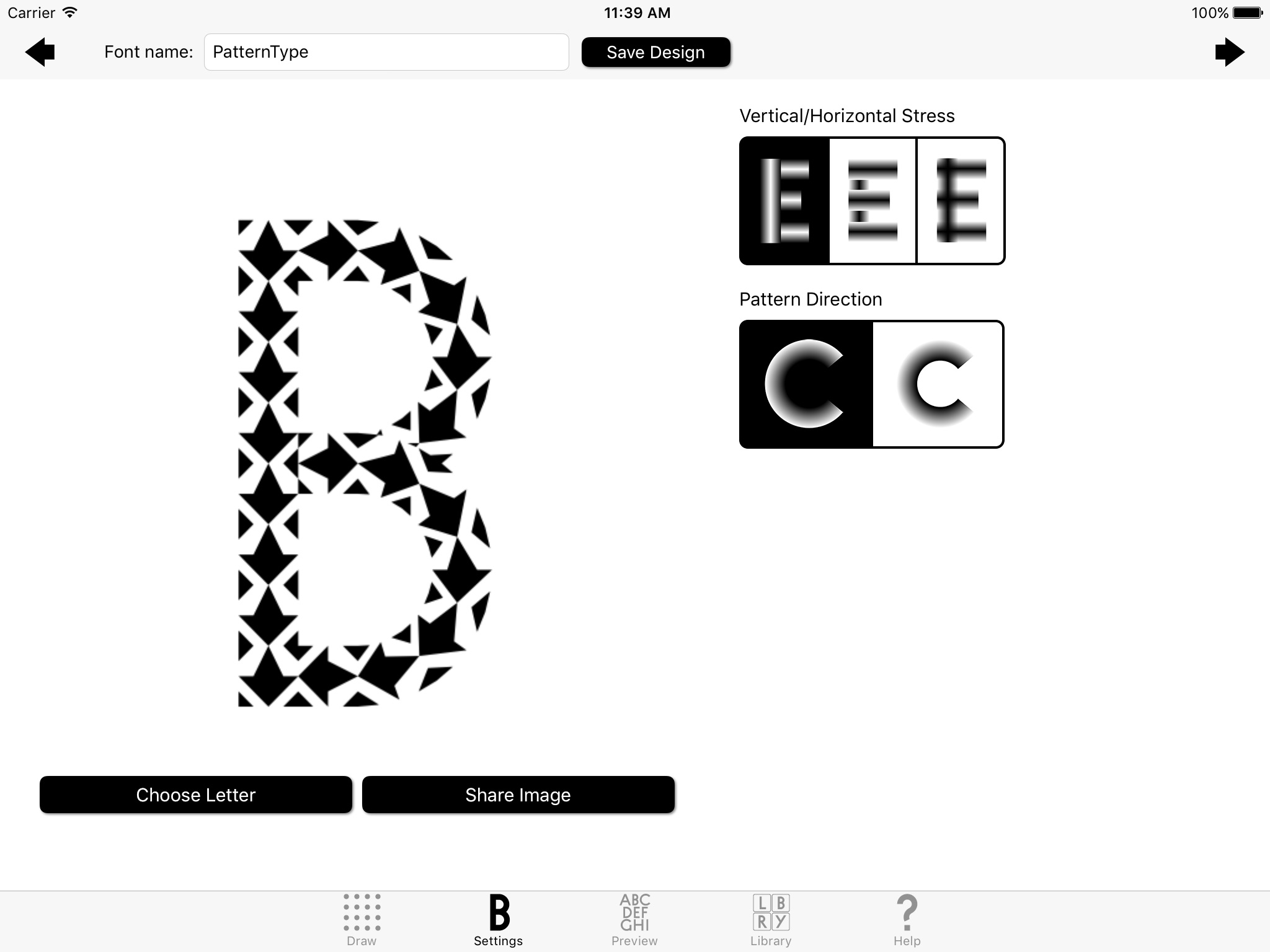 The Pattern Type App allows you to design patterns and generate typefaces composed out of these patterns. You can choose between weights, draw patterns and preview the generated letters, share or save your designs etc... The results are geometrical, caps only typefaces. Design is made simple with the graphical user interface. Download the result and use it to give your documents a very personal note.