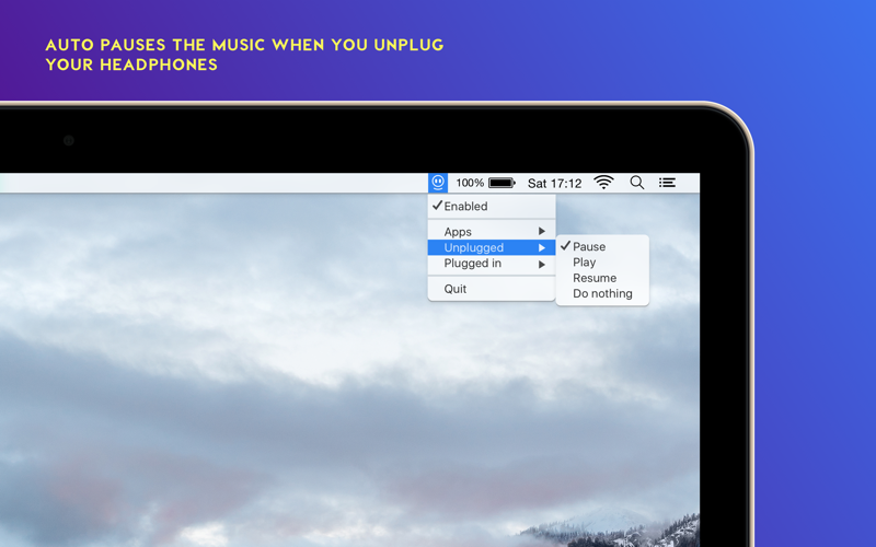 Automatically pause iTunes or Spotify when you unplug your headphones. PauseMate sits discretely in your status bar and detects when you unplug/plugin your headphones. You have the choice to either automatically Play, Pause, Resume or just do nothing when the app detects a change in the headphone jack.