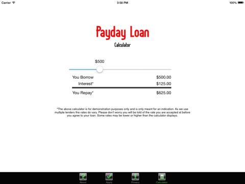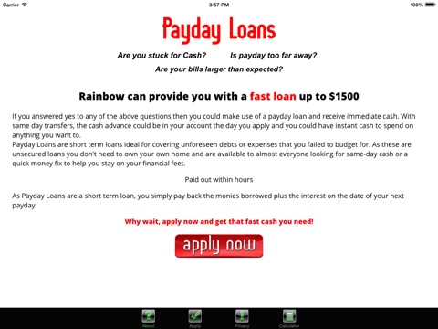 Make use of the Pay Day Cash Advance Calculator to see what your repayments will be, loan between $100-$1,500, download and apply now!