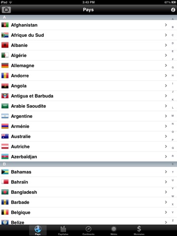 Cette application pourrait être bien si on pouvait aller au delà de la lettre C (pour les pays) ; car même si on choisit les lettres sur le côté, ça revient toujours au A ; serait-ce parce que lappui est gratuite ? sinon, merci de corriger.