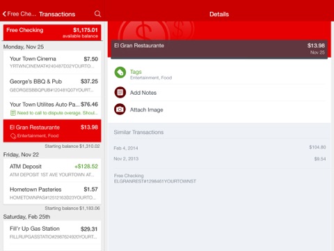 Add Tags, Notes, Images & Geo-Information: By enhancing transactions with custom tags, notes or photos of a receipt or check, you have the ability to stay organized and find exactly what you’re looking for when searching through your finances.