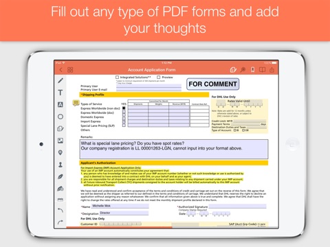 With PDF Forms you can fill out any kind of PDF forms. Open the form and fill in the fields. Moreover, your have the option to add remarks or comment any area in already filled documents.