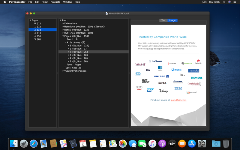 PDF Inspector is built on top of and powered by PSPDFKit, the same PDF engine trusted around the world by companies like Dropbox, Box, IBM, Atlassian, SAP, and Lufthansa.