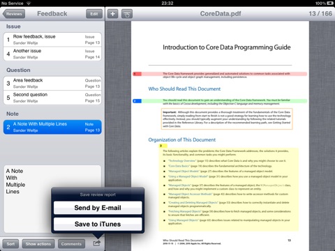 * A great application / business tool. I have just used this app to review 4x200+ page Tech design documents and it has saved me a lot of time and the authors were impressed with me providing an indexed snapshot of the pages relating to the comments ( it will also save them time).