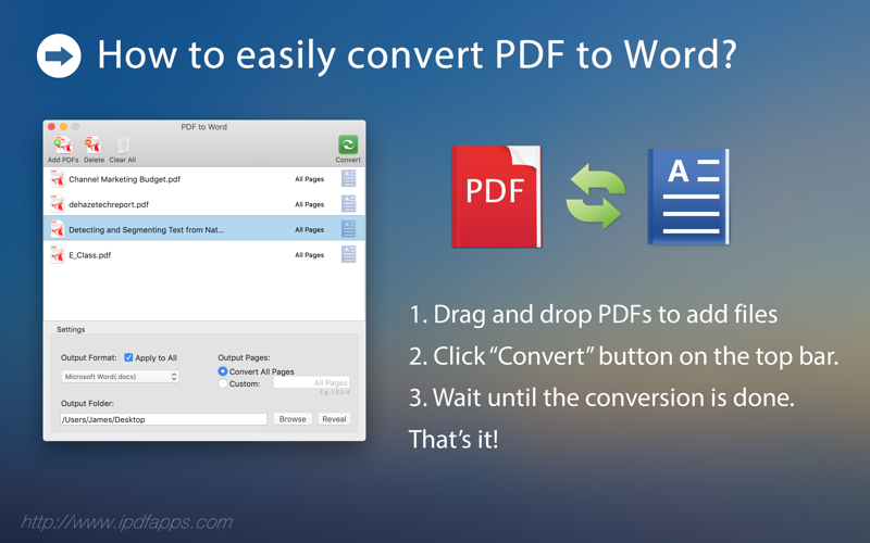 PDF to Word support macOS 10.8 ~ 10.14 and later macOS. it has very user-friendly interface and easy to use. Very fast conversion speed and no quality is lost complete documentation, and 100% fast speed to process PDF file locally.