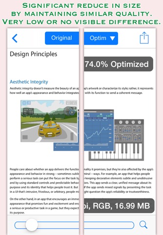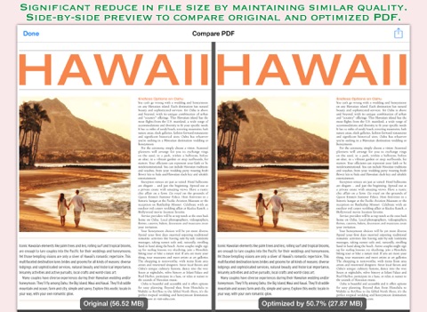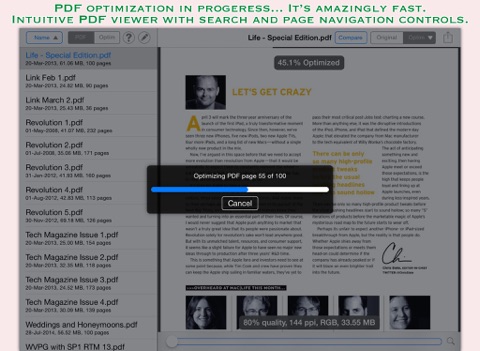 PDFOptim is a simple and intuitive way to compress, optimize and reduce PDF documents on iPhones and iPads. PDFOptim provides easy and effective ways to compress large image and graphics heavy PDF files. Inbuilt side-by-side preview to compare original and optimized PDF.