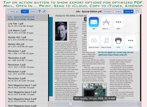 - Allows Optimized PDFs to Open In… another application, Mail, Message, Print, share PDFs to nearby iOS devices via AirDrop.