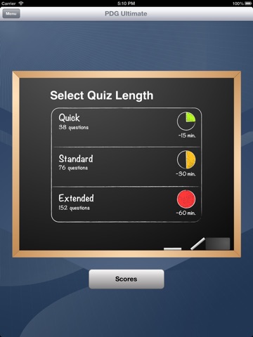 When you are ready for the real show, move on to Quiz Mode. This is your PFE/USAFSE simulator. Pick from three preset quiz lengths and do your best against a set of random questions pulled from each chapter. Stuck? You can skip questions in Quiz Mode, but don’t forget to come back and select an answer before you finish or they will hurt your score.