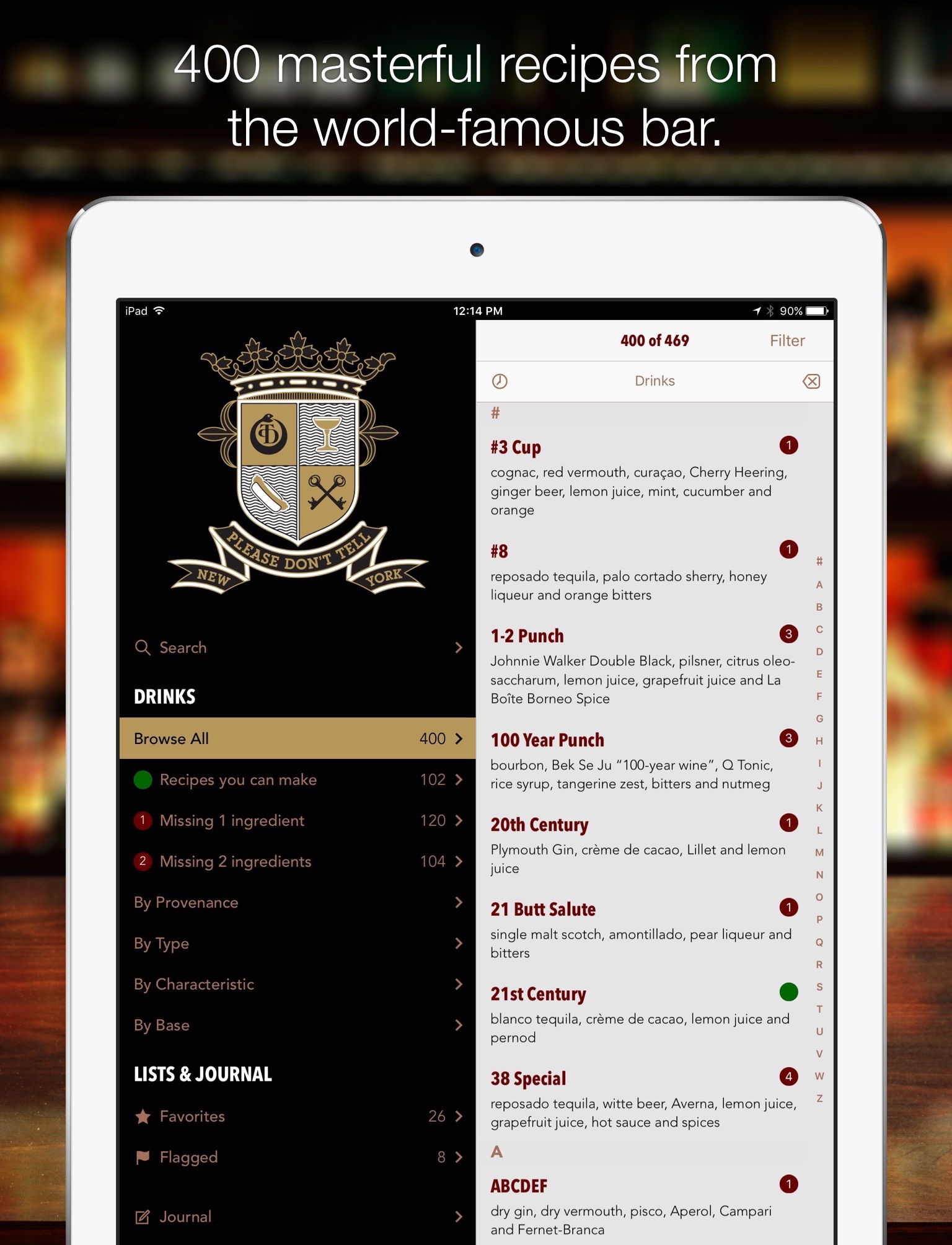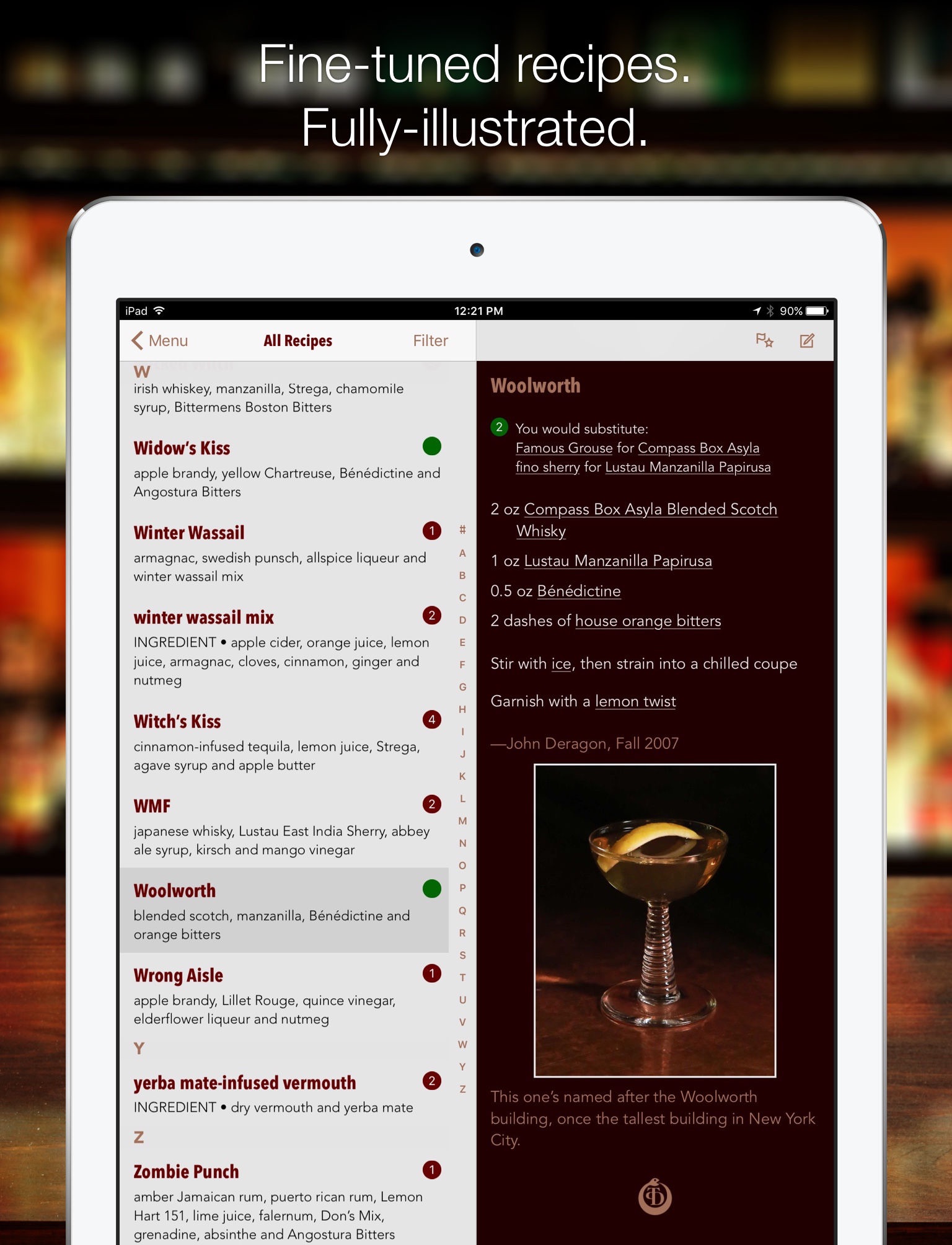 Awesome to have PDT recipes on my phone! Its missing a couple of my favorites from the book, but does have some additional recipes. The entire family of cocktail apps from this company are fantastic, I look forward to seeing them updated.