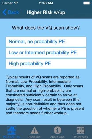 The gold standard diagnostic tests for DVT and PE are invasive venography and invasive pulmonary angiography (and autopsy). These tests are invasive, time consuming, technically challenging, and sometimes not feasible for a highly ill patient. No single alternative test alone is quicker, easier, less invasive, and as accurate. But combinations of tests starting with clinical scoring systems for pretest probability followed by sequential labwork and imaging can almost always do the job. The only problem is that the algorithms involved are very hard to memorize and keep straight. Thats where a point-of-care guide like this comes in. The app offers 1 algorithm for DVT diagnosis and 2 algorithms for PE diagnosis, as well as discussion of diagnostic approach and workup of hypercoagulable state.