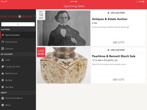 Never get outbid again! Now you can monitor your bids and place new ones on-the-go for any item in Peachtree & Bennett’s high-quality, fast-paced live auctions. Quickly browse new lots, watch items of interest, follow an artist, research past sales, and place both absentee and live bids – all from your phone or tablet. You can even consign items to Peachtree & Bennett’s well-attended auctions through the app! Peachtree & Bennett, a third-generation auction house based in Atlanta, offers unparalleled customer service as well as the most competitive fees available for both buyers and sellers.