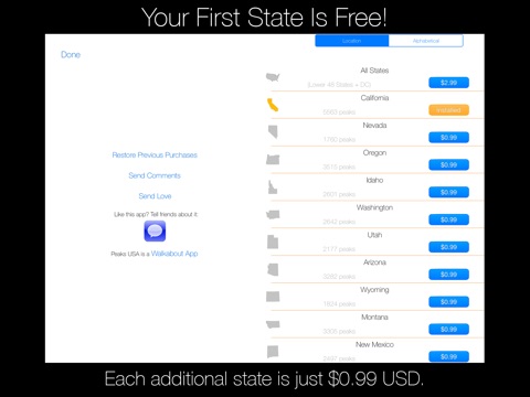 Peaks USA can label more than 70,000 federally recognized summits in the contiguous United States of America. Data for each state is downloaded separately within the app.