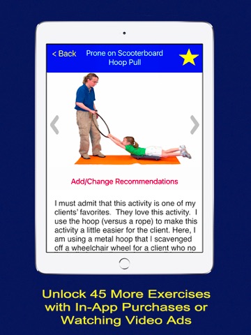 In order to facilitate easy home programming, favorite exercises can be starred with treatment programming specified. This feature will enable the clinician to add frequency, repetitions, number of sets, duration, weight resistance and notes to home programs with parents who have downloaded the app. I provide commentary with each exercise explaining, for example, tips on how to make the exercise more successful, how to make the exercise easier or more challenging, and the type of client with whom I often use the specified exercise. Why wait for 25 years of clinical experience, when you can have my suggestions now? Download the app now!