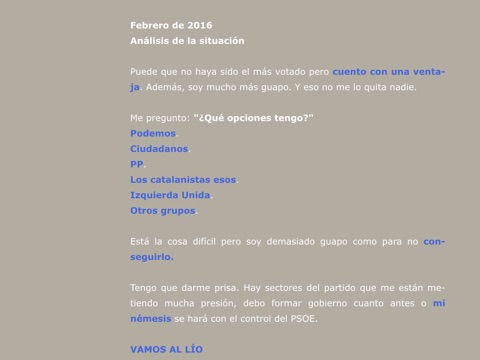 Pedro Sánchez Simulator 2016 es un simulador político en el que tomas la figura de Pedro Sánchez en el dificultoso camino hacia la presidencia de ESPAÑA.