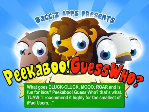 What goes CLUCK-CLUCK, and MOOO, and is brand new for iPad!? " Peekaboo! Guess Who? " thats what! The fun, intuitive game that gets kids excited about learning their favorite animals and the sounds they make.