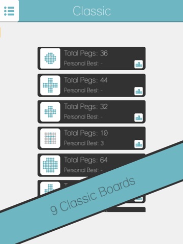 Peg Solitaire offers 9 different challenging boards: English Board, European (or Continental) Board, Wiegleb Board (Germany), Asymmetrical, Diamond and Triangular Boards.