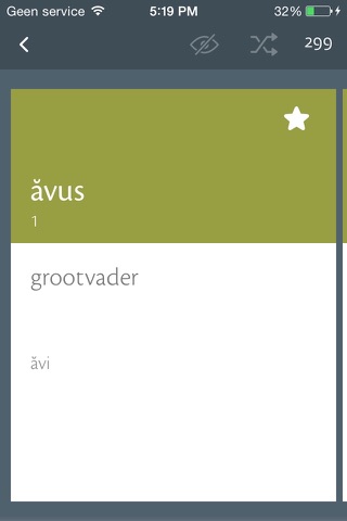 Kies een caput of caputonderdeel. Raadpleeg de woordkaartjes. Nu kun je de woorden op volgorde of willekeurig leren, voor dit laatste activeer je de twee pijltjes rechts bovenaan. Je kun er ook voor kiezen om de vertaling te verbergen, hiervoor activeer je het oogje rechts bovenaan. Wil je een woord toevoegen aan je eigen woordenlijst met moeilijke woorden, activeer dan het sterretje op het woordkaartje.
