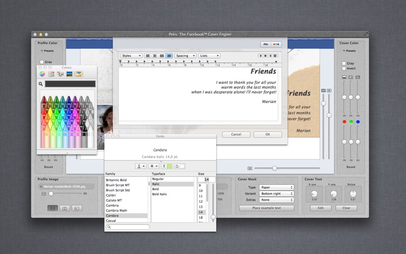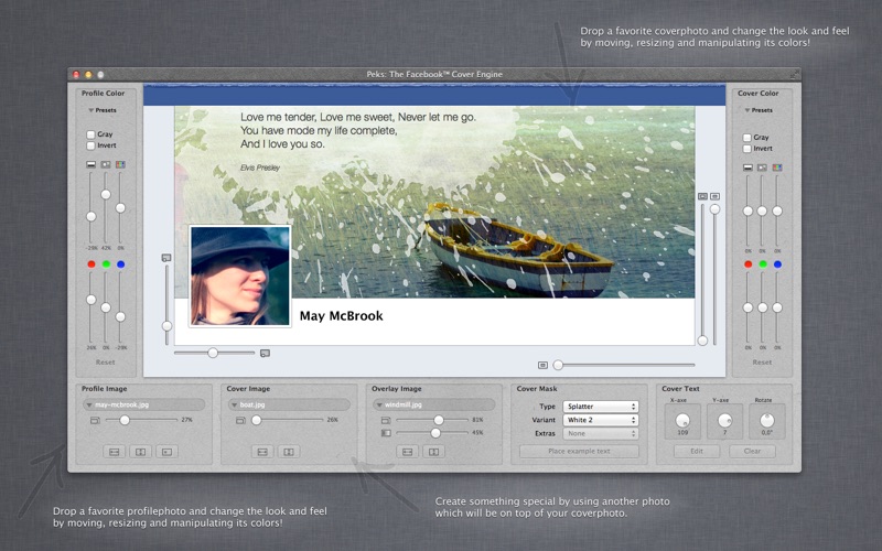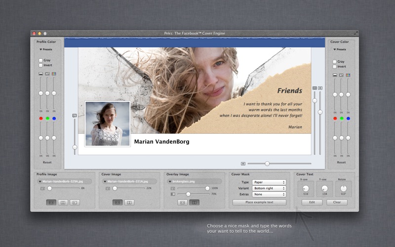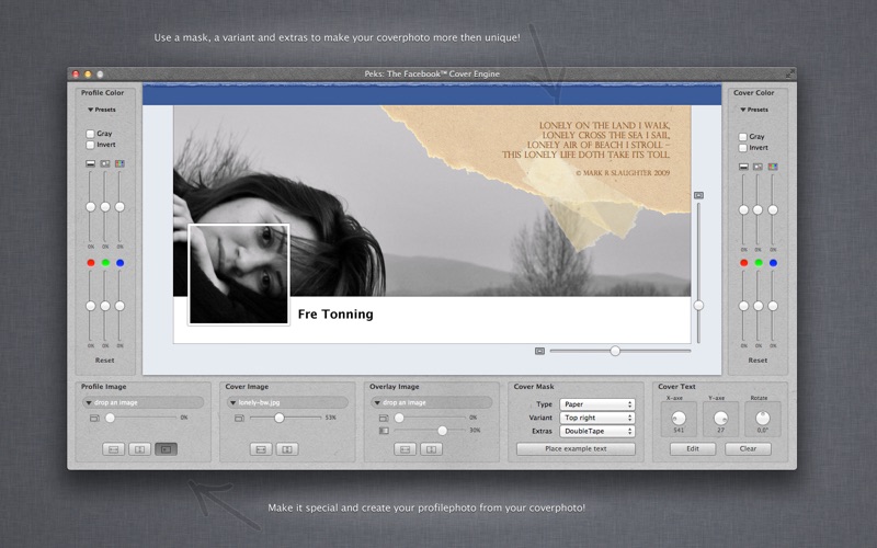 Create amazing Covers for your Facebook™ Timeline! Lots of people update this image several times a year. However, many lack the skills or software to design something truly beautiful. That’s why we created Peks: To help you to make your Timeline a little bit fancier! Use your Facebook™ Timeline cover to tell some more about yourself! Spread some news! Be creative!