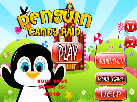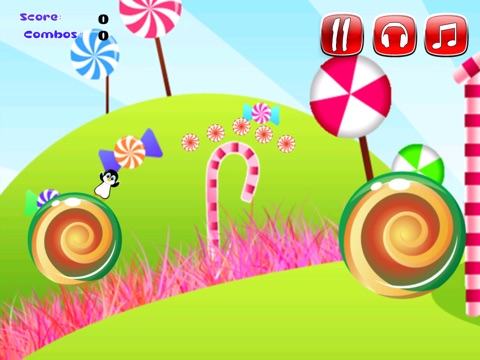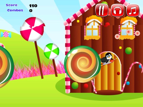 Please help your candy raiding penguin who is determined to cross through the maze of spinning candy wheels. Along the way he must collect candy and coins to achieve the highest possible score. Your goal is to help our candy penguin reach new heights in this action packed game!