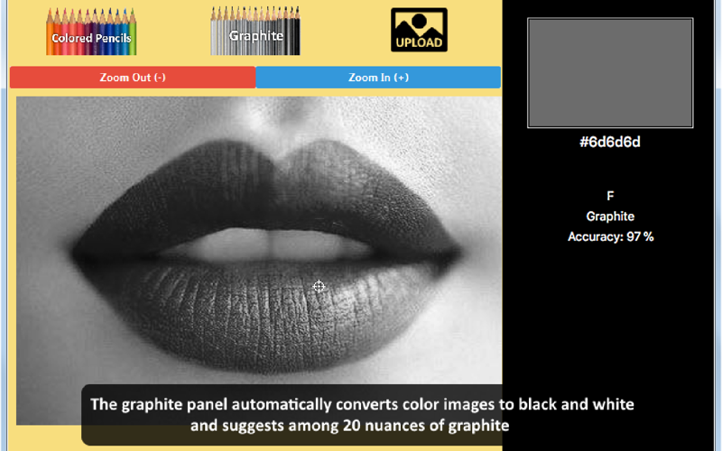 The graphite panel automatically converts color images to black and white and suggests among 20 nuances of graphite by any brand.