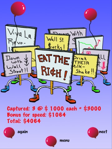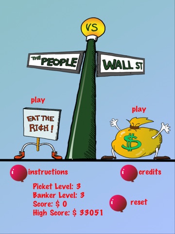 Play as one of The People: While you occupy Wall Street, ensure that the corrupt also occupy jail! Tap on the screen in the direction you want your character to go, and capture the fleeing bankers before they catch their corporate jets and take their bonuses and bailouts to the Cayman Islands. Bask in the glory of how you helped them along on their riches to rags story, and enjoy your portion of the redistributed wealth. With each new level, more and more bankers try to flee town with their ill-gotten gains. Capture as many as you can, or live with the knowledge that the corrupt will bask in the sun sipping their punch, spiked with the dreams of the poor.