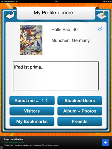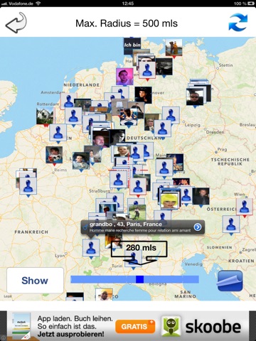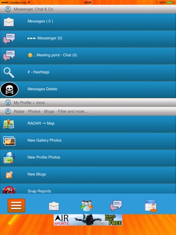 20 languages, chat from the App users send messages, voice messages, user-profile with albums, view profile, save contacts, message center, push notification of new messages, photo upload directly into your Facebook profile photos other app users to send comments, friends list, status message on the RADAR-Map and profile, user blocking, visibility settings, user-radar, Events map, Events.