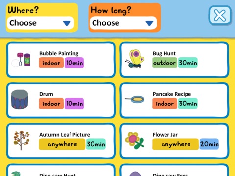 As a parent you can choose to See All for a comprehensive list of activities - just select one then follow the step by step instructions. If your child wants to get involved you can search for a random activity by using the Generator, where they can press a variety of buttons to get some silly surprises.