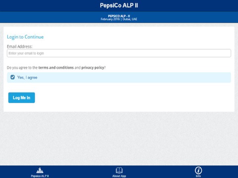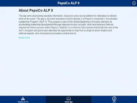 The app is an event assistance tool for Module 2 of PepsiCo University’s “Accelerated Leadership Program” (ALP-II). This program is part of the Global leadership curriculum and aims at accelerating leadership development through exposure to key concepts, skills and behaviors that are required for future success within PepsiCo.