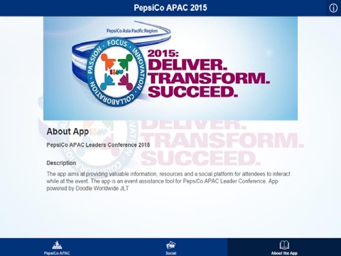 The app aims at providing valuable information, resources and a social platform for attendees to interact while at the event. The app is an event assistance tool for PepsiCo APAC Leader Conference. App powered by Doodle Worldwide JLT
