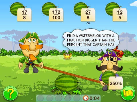 On the first island the player learns to convert beetween fractions and percent. In order to do so he/she offers the pirates some slices of pizza and try to guess what part of the pizza is left for other pirates to eat in the boat. If there is a mistake the pirates get in trouble.