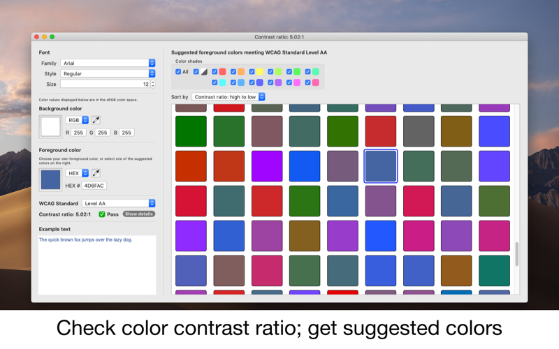 Just provide the background color you want to use and instantly get foreground color suggestions that will work best for your background color. All you then need to do is just choose one of the suggested colors. The contrast ratio between the background color and the foreground color you chose will be shown, but all suggested colors will meet or exceed the WCAG Standard. If youre happy with the chosen color, you can then simply copy and paste it into other apps as RGB, HEX, or HSB color values.