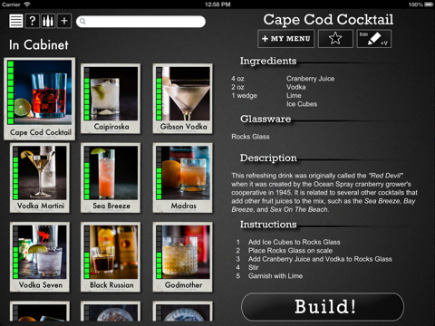 The Cabinet feature allows you to select the ingredients you have on-hand and sorts the cocktails in order: From highest percentage match to lowest.