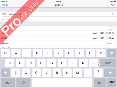 Persian Calendar Pro able to access all events of any selected month that you have in your Calendar application on the iPhone/iPod/iPad. Persian Calendar Pro is the ONLY Persian Calendar able to fully interact with your iDevice Calendar default application including adding new events to your calendar.