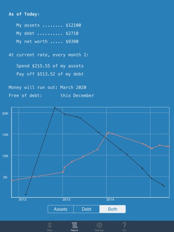 Input your assets values, either from time to time or on the regular basis, and get the big picture where your finances are, current and projected.