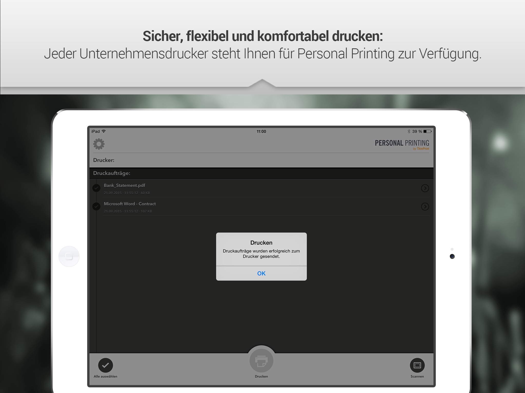 Initiate print jobs easily with your iOS device. ThinPrint Personal Printing is an innovative, cost-effective and secure pull-printing solution which allows you to print flexibly to any printer in your corporate network. Simply equip your printers with stick-on bar codes – no additional hardware or specific printer models are required.