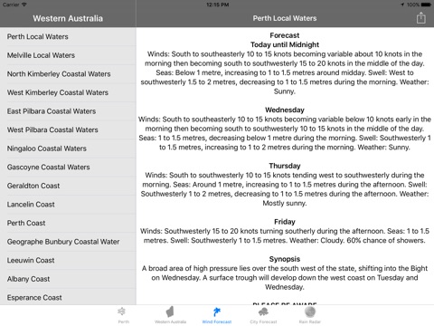 4) Perth and Western Australia coastal wind forecasts including Synopsis and Warnings