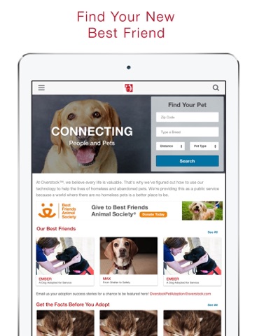 Welcome to the Pet Adoptions App by Overstock.com. Search for adoptable cats, dogs, and other pets from thousands of animal shelters and rescues nationwide. At Overstock, we believe every life is valuable. That’s why we’ve figured out how to use our technology to help the lives of homeless and abandoned pets. We’re providing this as a public service because a world where there are no homeless pets is a better place to be. Use this app to quickly search for dogs, cats, reptiles, birds, horses, and more, right in your own area. Pet Adoptions by Overstock – connecting people and pets!
