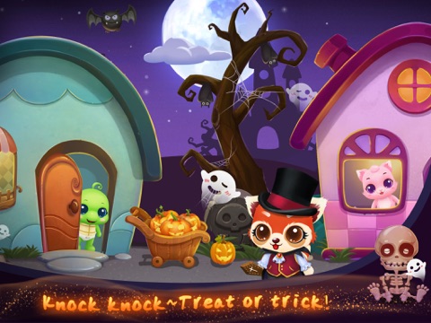 Open the game and choose your favorite animal to start. Your first sight will be caught by several houses on a street, where you can easily enter by knocking the door. Firstly click your cute little things home and get it dressed up there. After that, you can return to the street with the back arrow. Next is the treat-or-trick time, slide the screen then freely choose a house to play the mini games. And whenever you want to take a snap, the Photo Booth will be an unmissable place to go. Besides, all the mysterious things in the Haunted House are waiting for you to unveil. Cant wait to check out the surprises behind the doors? Go ahead~ Its a now-or-never chance to experience the extraordinary night.