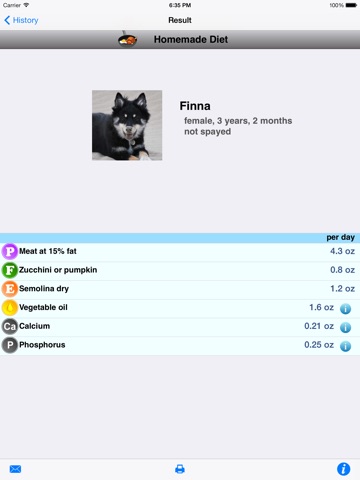 - the amount of each selected component and the quantity of calcium and phosphorus you should add as a dietary supplement, in case of a homemade diet