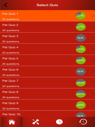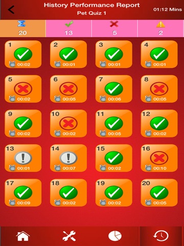 - You can review a quiz session performance details by selected a session. This screen shows quiz history performance reports.