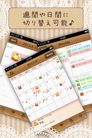 仕事、部活、バイトなど何気ない予定も可愛いスタンプでデコれ、あなたの日々の生活をサポートします。