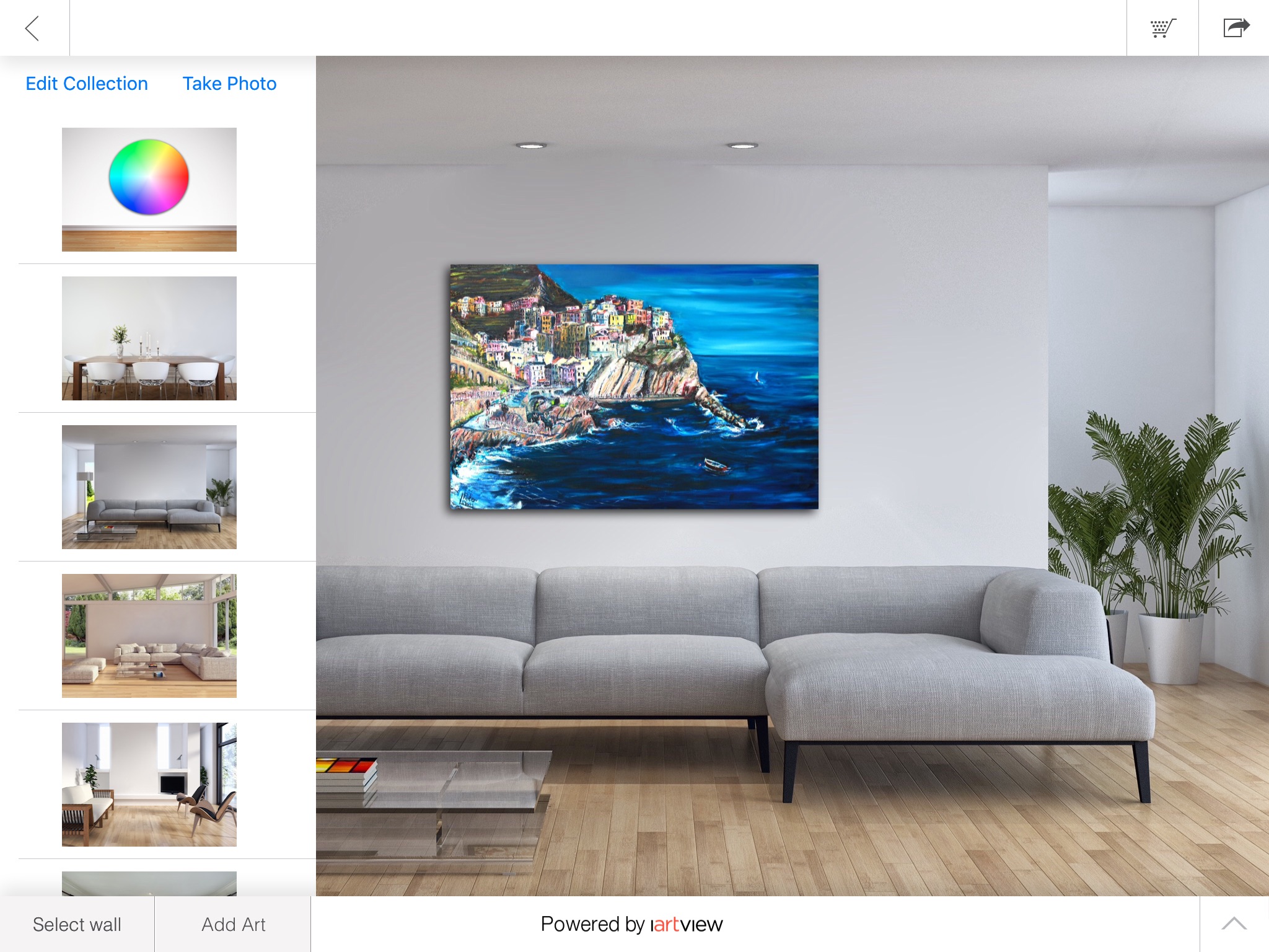 - View multiple artworks on the wall of your home or on designer walls from our "wall gallery".