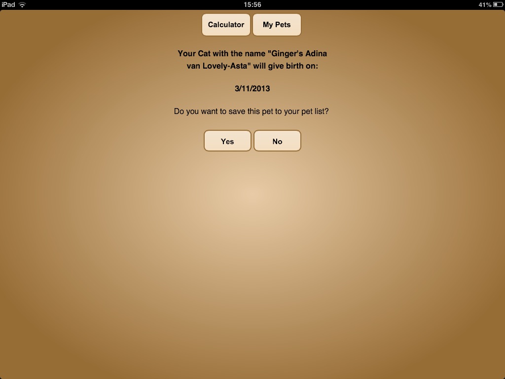 This app helps you calculate when your pet is going to deliver her youngs. You can input the mating date and the app calculates when your pet is due to deliver (within a timespan corresponding the animal kind). The app also calculates when the newly born pets can be placed in a new home.
