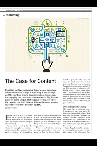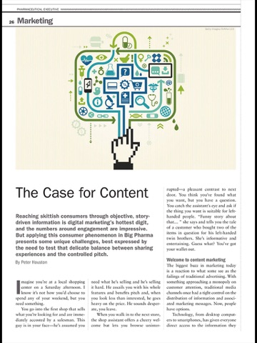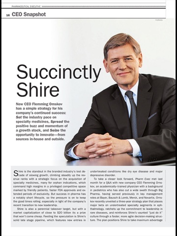 Pharmaceutical Executive is focused on serving the information, analytical and affiliation needs of the “c suite” of senior executives engaged in key segments of the industry, including human innovative and generic manufacturers, consumer health, medical devices, diagnostics and vaccines. It provides these services in a variety of platforms ranging from print and digital on-line to interactive web casts, podcasts, and video. Editorial content is focused on the broad theme of the interaction between health, policy and business. It is forward looking and designed to inform readers of trends and best practices around the functional priorities of the “c suite,” from R&D to strategy, business development, promotion, market access, IP and information technology. Repeated audience surveys finds that Pharmaceutical Executive carries high name recognition as the key industry read, particularly on the personalities and the background that drive decisions on business fundamentals.