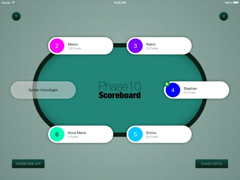 Endlich Schluß mit der nervigen Rechner- und Schreiberei nach jeder Phase 10-Runde! Nutze die Phase 10 Scoreboard-App um Punkte nach jeder Runde zu notieren und automatisch zusammenrechnen zu lassen. Obendrein hast Du dank der genialen App jederzeit einen Überblick, welcher Spieler sich aktuell in welcher Phase befindet und wer der Kartengeber in der jeweiligen Runde ist.